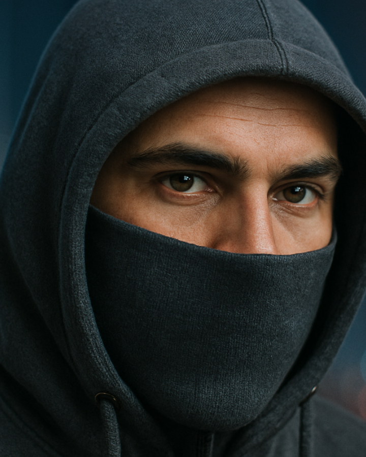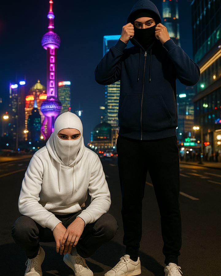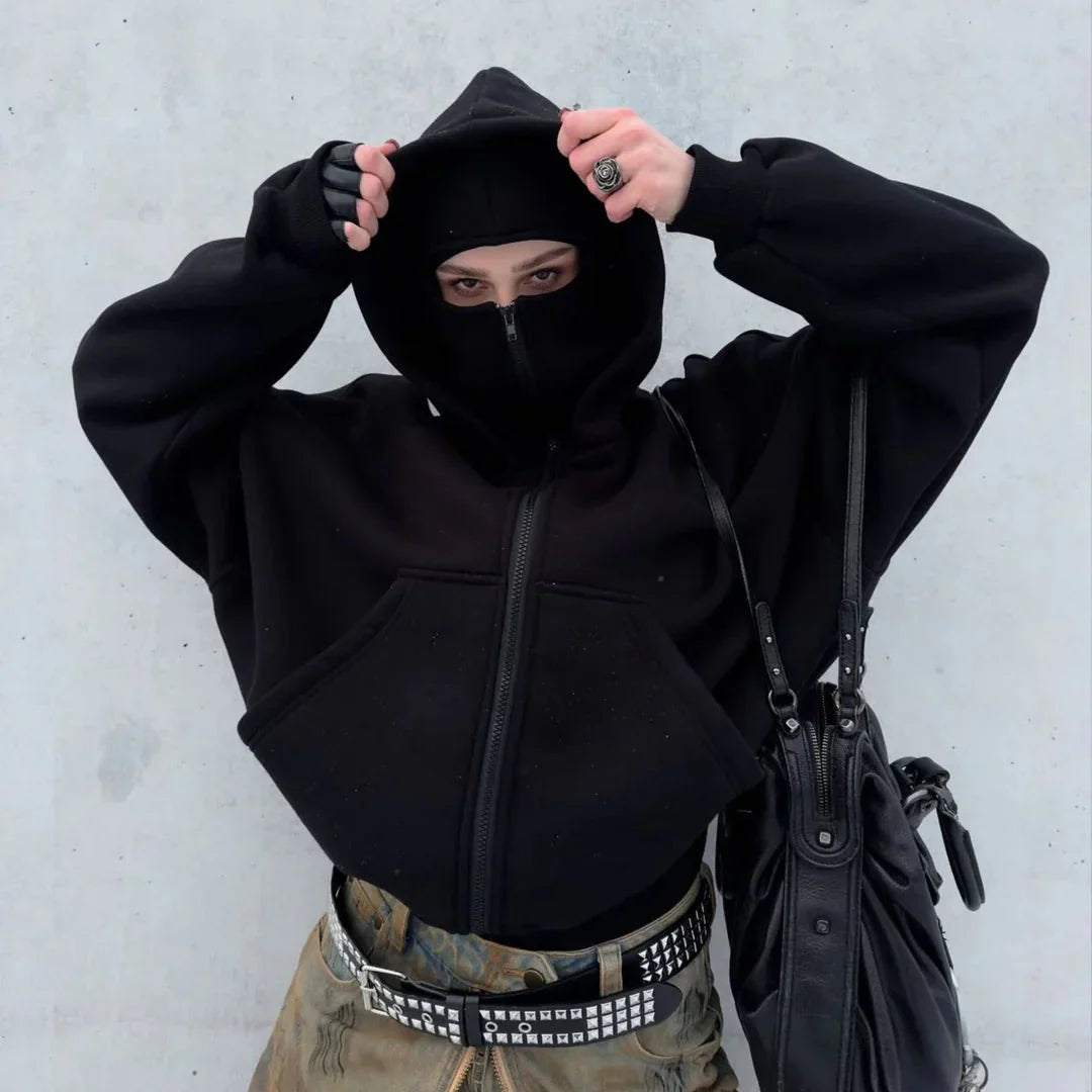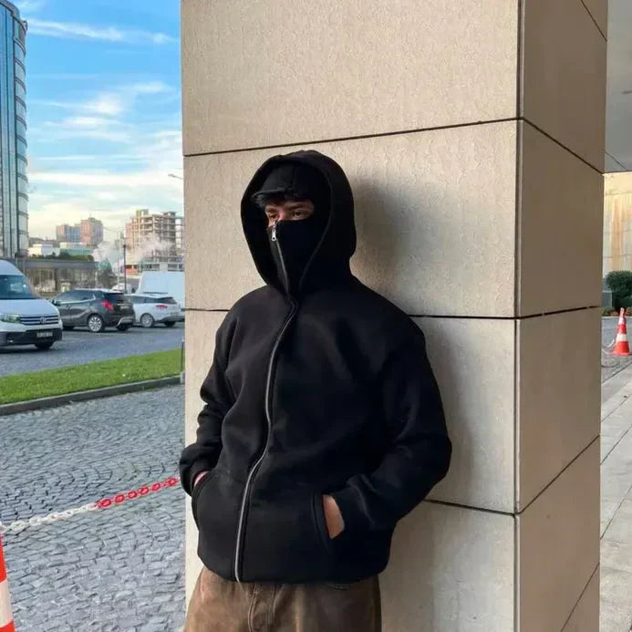 Ce n’est pas un simple sweat. C’est une pièce pensée pour l’attitude : cagoule intégrée, zip montant, coupe structurée, matières denses.